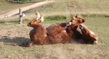 Caption for photograph "Flash having a roll after a day out riding!"